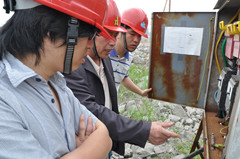 图为,4月28日,检查组在台州泰露纳有限公司工地检查安全用电。。(杨台彪)