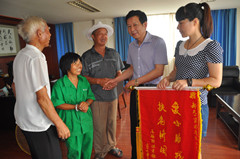 7月17日上午,椒江区前所街道东路村洪秀德将一面书有:“爱心助残、扶贫济困”的锦旗送到新天一集团有限公司。一家三口人握着公司董事长葛昌雨的手连声道谢,感激之情溢于言表。