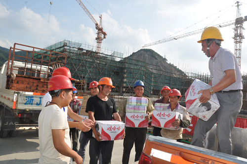 7月20日,在新天一集团有限公司三门万金山建筑工地,该集团公司工会干部为高温天气下作业的建筑工人送去毛巾、矿泉水、香皂以及防中暑药品,为一线工人送去炎夏的清凉。