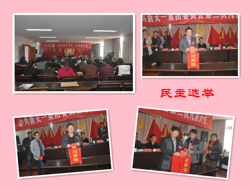 中共新天一集团有限公司第二次代表大会召开2013年11月23日,中共新天一集团有限公司第二次代表大会在公司会议室隆重召开。会议选举产生了中共新天一集团有限公司第二届委员会。 中共新天一集团有限公司第二届委员会由葛昌雨、葛军锋、李德宝、冯永兴、项美丽、葛法富、王会萍等七位同志组成。